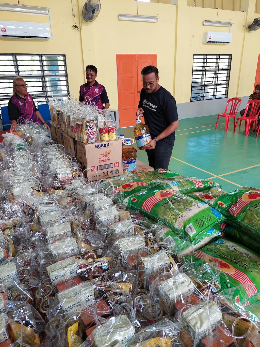During the programme, a total of 3000 beneficiaries from Kampung Labu Lanjut and Bandar Baru Salak Tinggi received daily necessities such as cooking oil, rice, canned sardines, coffee, and tea.